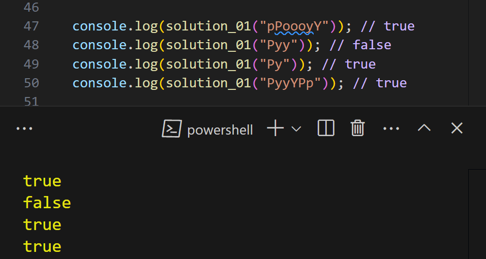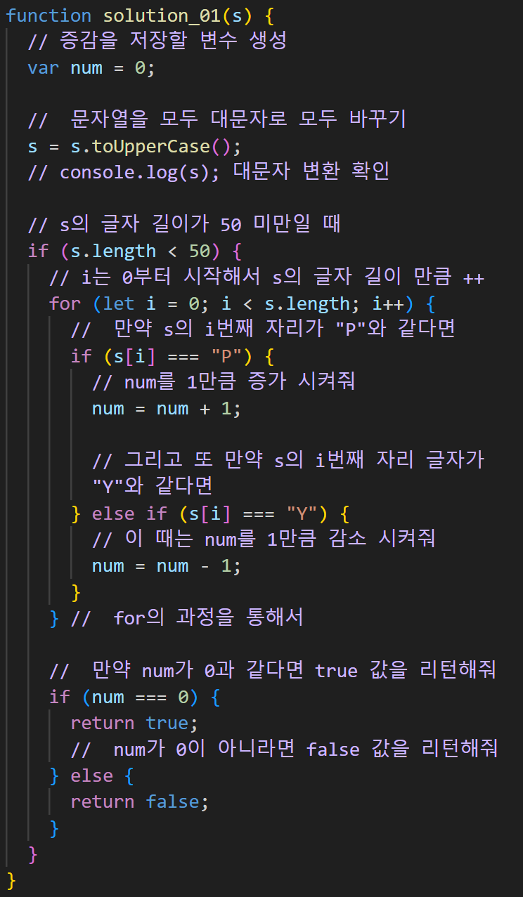 대문자와 소문자가 섞여있는 문자열 s가 주어집니다. s에 'p'의 개수와 'y'의 개수를 비교해 같으면 True 값을 return하고 다르면 False를 return하는 solution를 완성하세요. 'p', 'y' 모두 하나도 없는 경우는 항상 True를 리턴합니다.