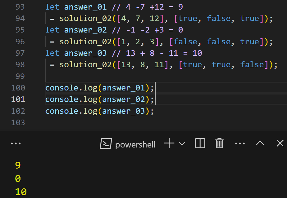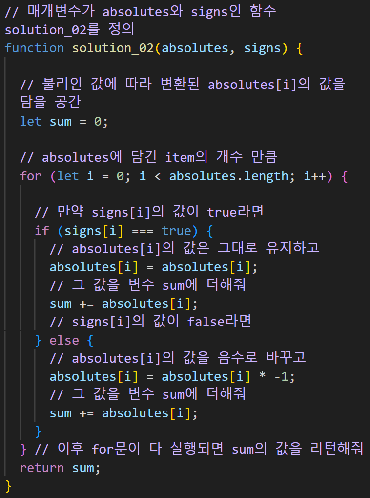 어떤 정수들이 있습니다. 이 정수들의 절댓값을 차례대로 담은 정수 배열 absolutes와 이 정수들의 부호를 차례대로 담은 불리언 배열 signs가 매개변수로 주어집니다. 실제 정수들의 합을 구하여 return 하도록 solution 함수를 완성해주세요.