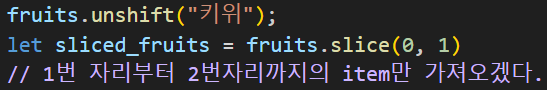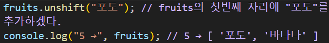 - unshift : 배열 첫번째 자리에 item을 추가하는 메서드