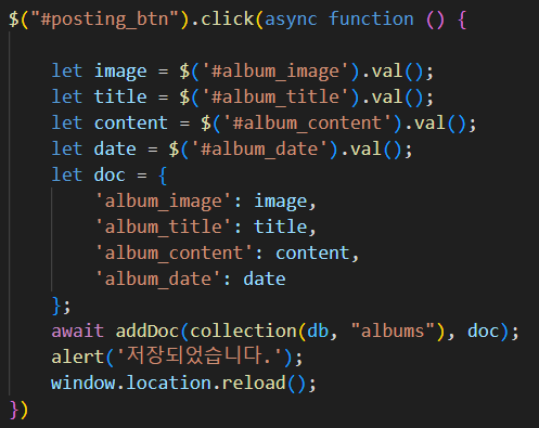 2) 입력창에 입력된 앨범 사진, 제목, 내용, 날짜의 입력값을