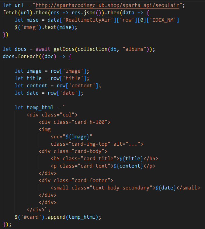 7) Firestore에 저장한 데이터를 'getDocs' 통해 웹사이트로 가져와 입력 값에 맞는 카드를 생성시킨다.
